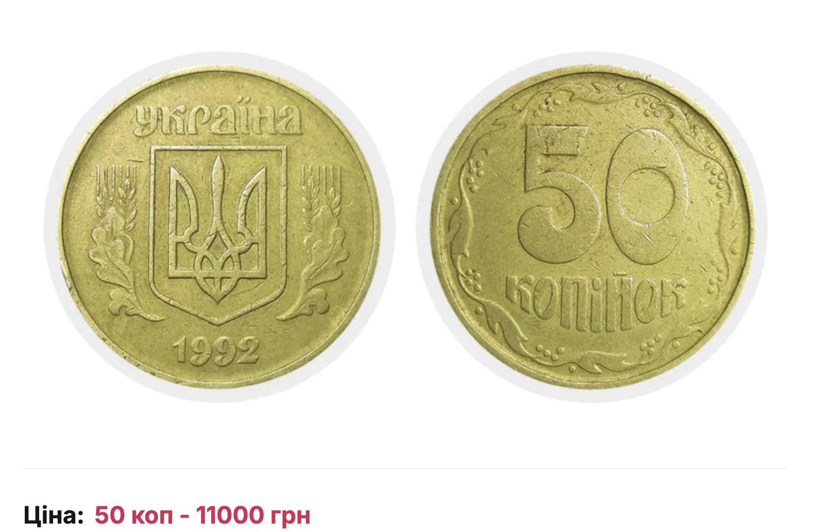 На сайте "Монеты-ягодки" пишут, что 50 копеек 1992 года — оборотная монета Украины. Ее делали на Луганском станкостроительном заводе разным типом штампов. Поэтому появилось большое количество разновидностей, среди них редкие, цена которых доходит до 11 000 грн.