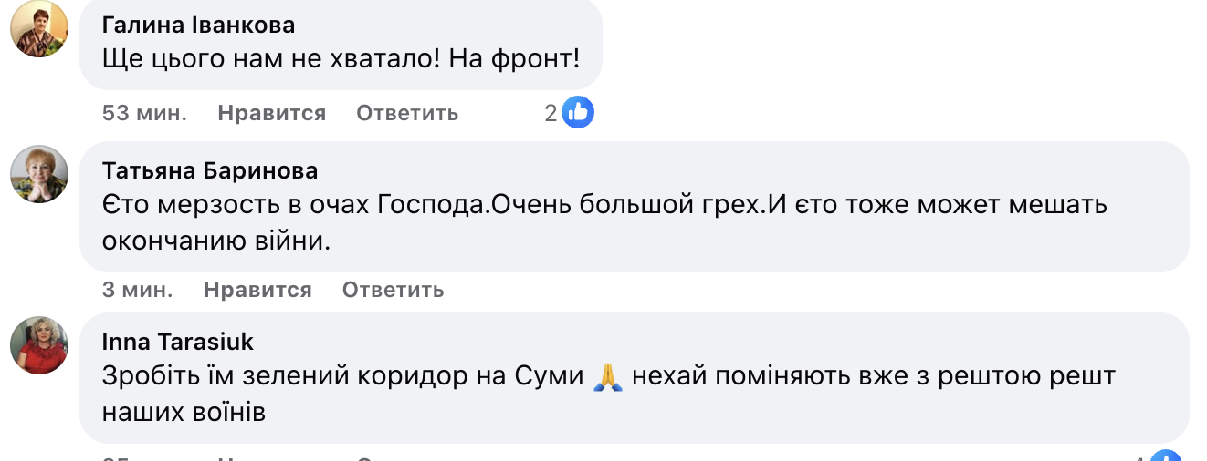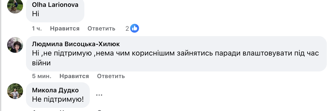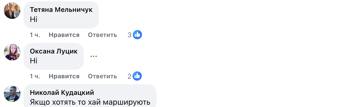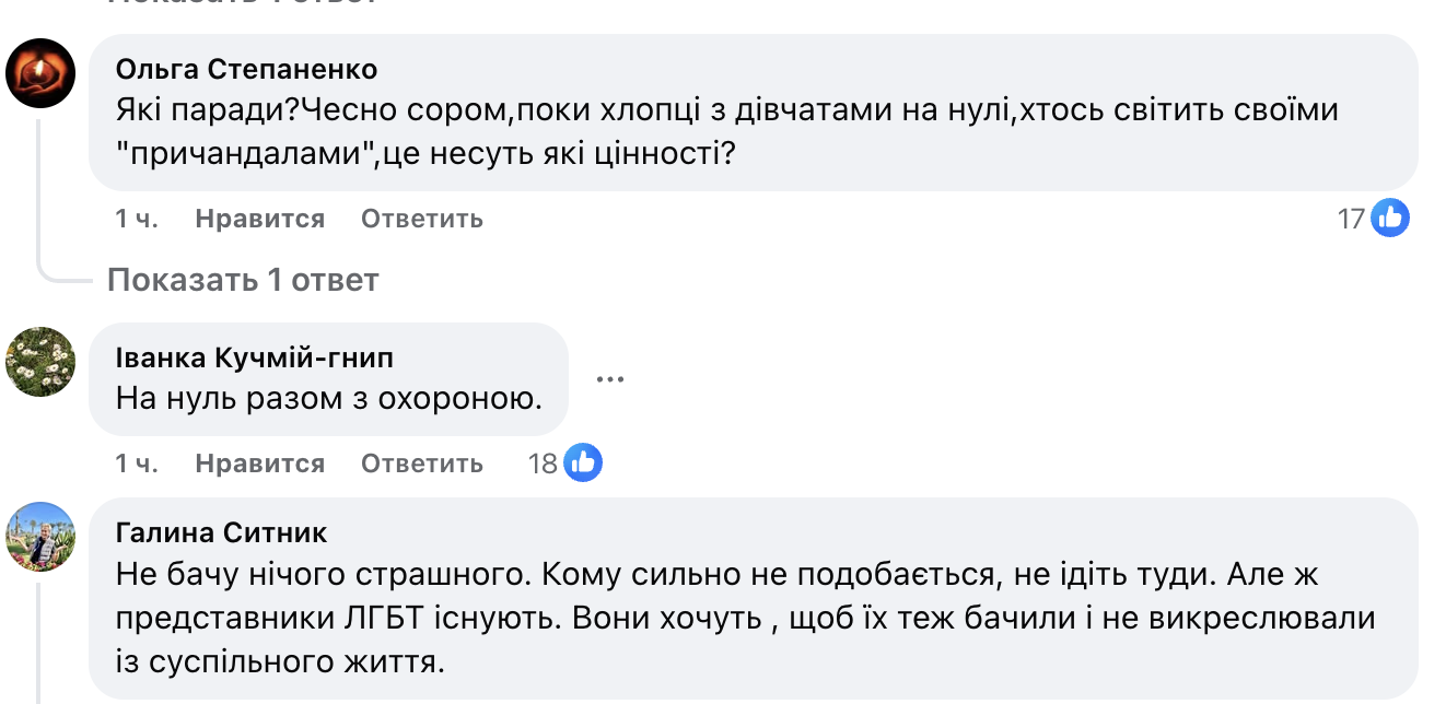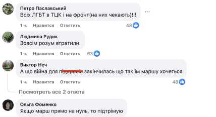 В комментариях же пользователи отмечали, что вообще эти парады не должны проходить при любых условиях, некоторые даже ссылались на религию. Были и те, кто все же поддерживал Марш Равенства, но их было в разы меньше. Многие реагировали достаточно агрессивно, призывая отправить участников парада на фронт и т.д.