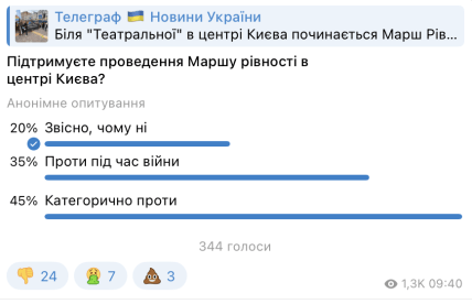 Заметим, что мнение большинства украинцев совпало в обеих сетях. Ведь из общего количества опрошенных в Telegram более 45% людей вообще не поддержали ЛГБТ-парад, считая его неуместным в любое время. При этом только 35% против парада во время войны и 20% поддерживают его в любом случае.