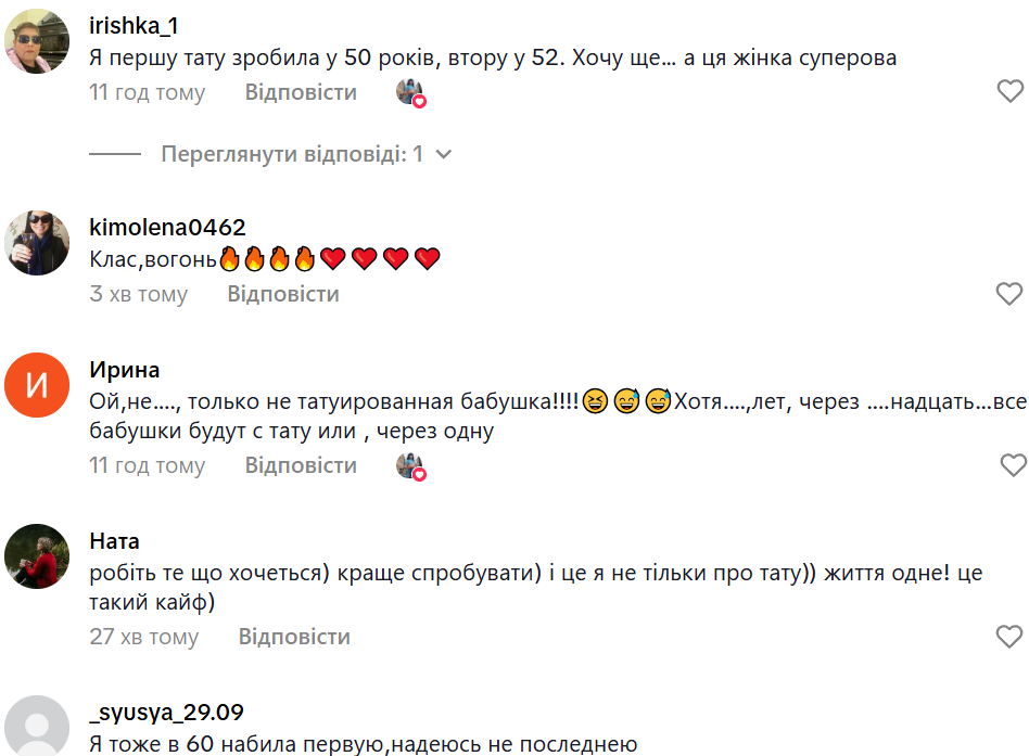 В комментариях под роликом некоторые поделились подобным опытом и рассказали, что также сделали первую татуировку в 50, а кто-то и в 60 лет.