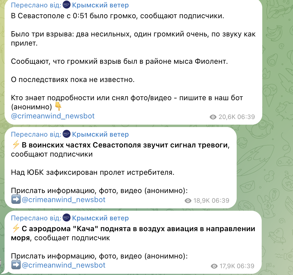 Кроме того, поступают сообщения о сигнале тревоги в военных частях Севастополя и фиксации пролета истребителя над городом.