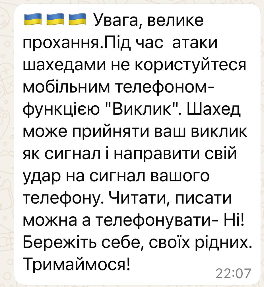 "При атаке не пользуйтесь мобильным телефоном — функцией "вызов". "Шахед" может воспринять ваш вызов как сигнал и направить свой удар на сигнал вашего телефона", — говорится в фейковом сообщении.