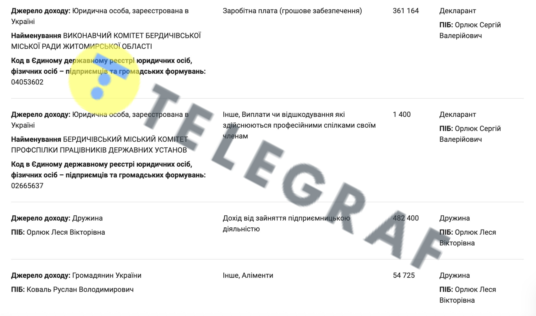 Согласно документу, мэр Бердичева за 2024 год заработал 361 164 грн, а его жена получила доходов от предпринимательской деятельности 482 400 грн. При этом еще 1400 грн Орлюку было возмещено профсоюзом города. К слову, Леся Орлюк в 2024 году получила еще 54 725 грн алиментов.
