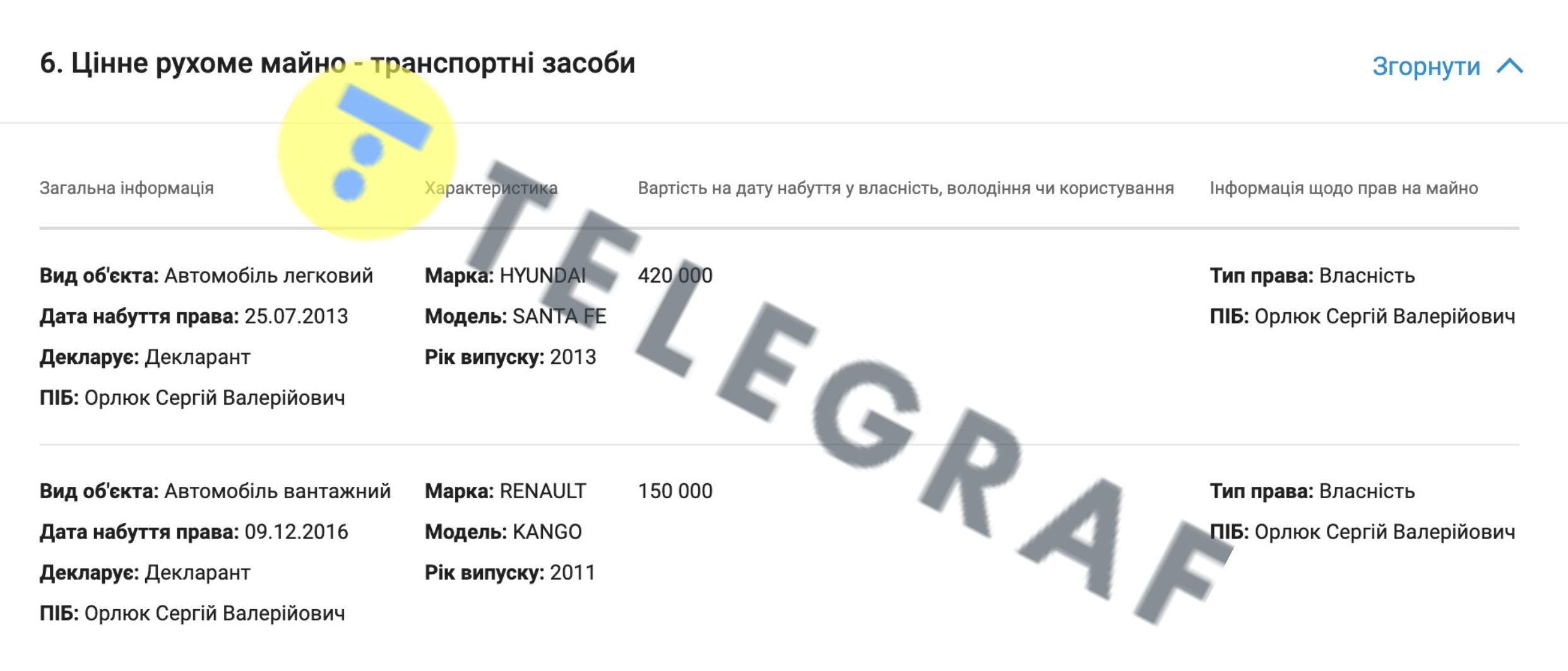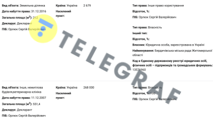 У супругов есть два автомобиля, зарегистрированных на мэра Бердичева, HYUNDAI за 420 000 и RENAULT за 150 тысяч. По недвижимости задекларировано: два земельных участка, ветеринарная клиника "Айболит", где Орлюк долгое время занимался частной практикой. Также у супругов есть немалые сбережения, в том числе наличными Орлюк Сергей хранит 110 тысяч грн, а его жена — 95 тысяч грн.