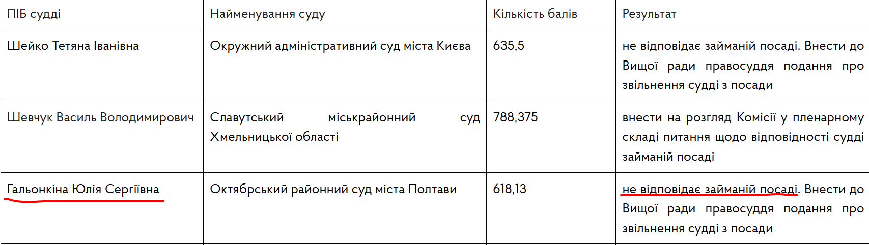 Судья Октябрьского райсуда Полтавы Юлия Галенкина в ноябре 2024 года была признана не соответствующей занимаемой должности. Высшая квалификационная комиссия судей (ВККС) внесла представление об увольнении, но Высший совет правосудия откладывает рассмотрение этого вопроса. Галенкина в 2024 году заработала более миллиона гривен, а также ее семья получила подарков на кругленькую сумму.