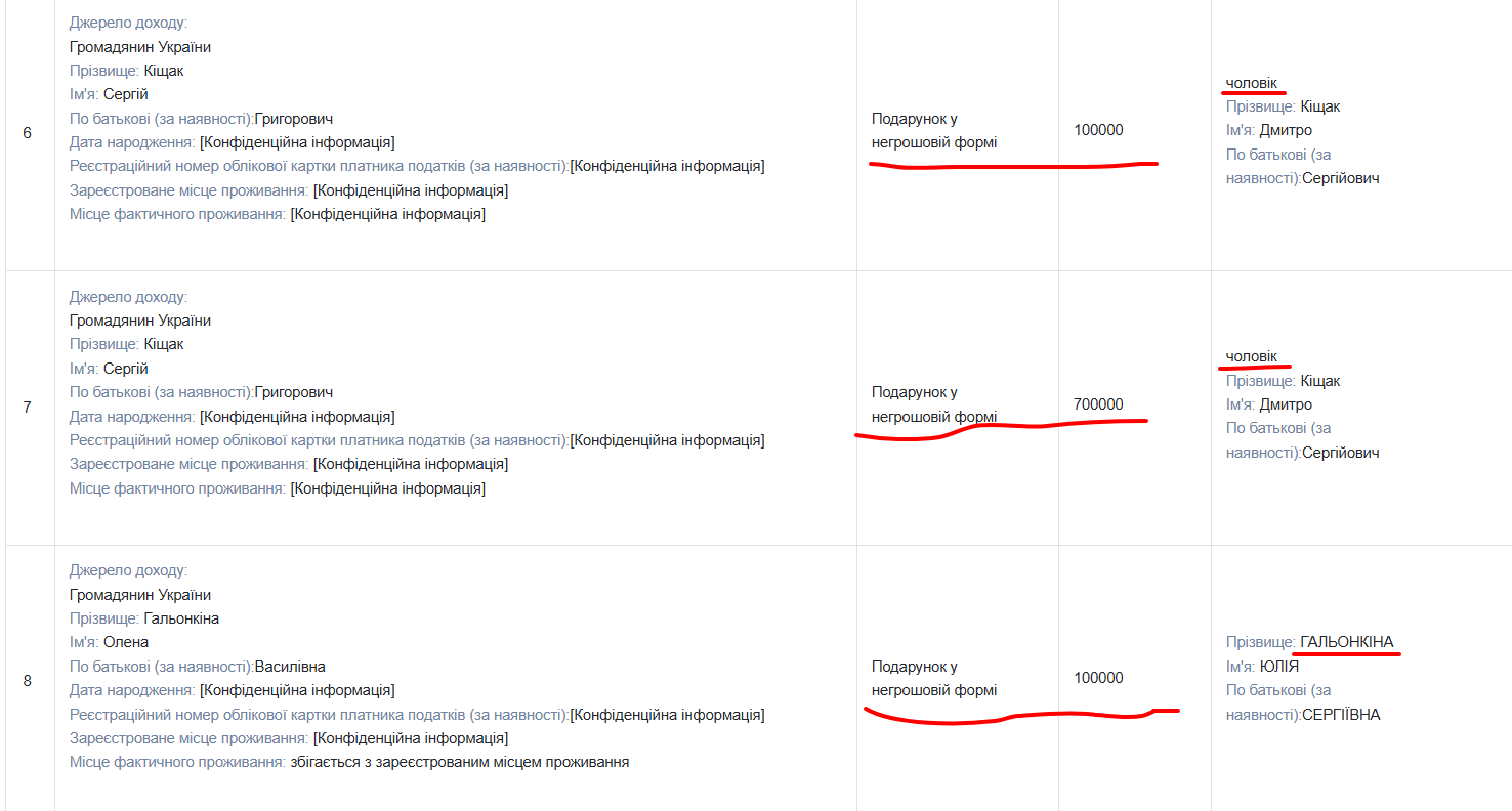 Муж Галенкиной Кищак Дмитрий Сергеевич получил два подарка на сумму 100 тысяч гривен и 700 тысяч гривен от Сергея Кищака (вероятно своего отца). Сама судья Галенкина получила подарок на сумму 100 тысяч гривен от Елены Галенкиной.