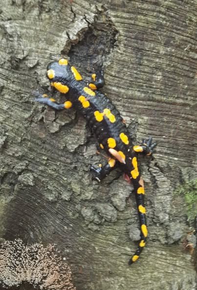 Пятнистая саламандра (Salamandra salamandra) — это одно из самых больших хвостатых земноводных Украины, длина взрослых особей достигает 15–25 см. Ее тело имеет черную окраску с яркими желтыми пятнами неправильной формы, выполняющими маскировочную и предостерегающую функции. Рисунок пятен варьируется у разных особей, иногда они могут отсутствовать.