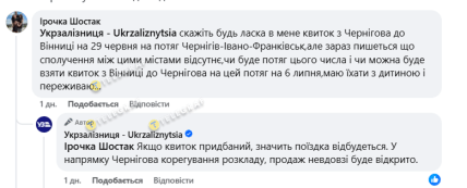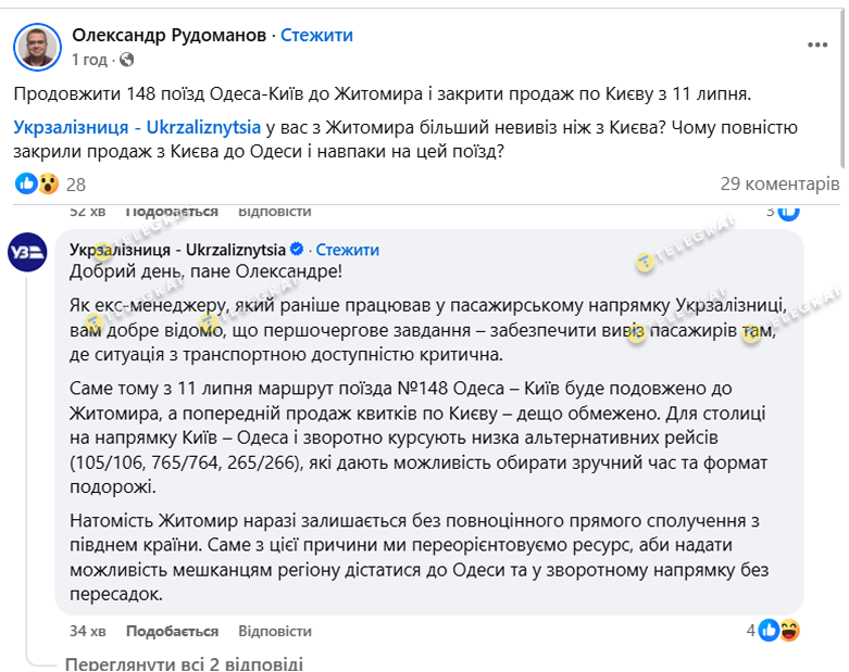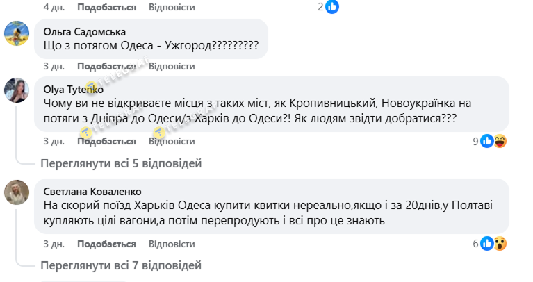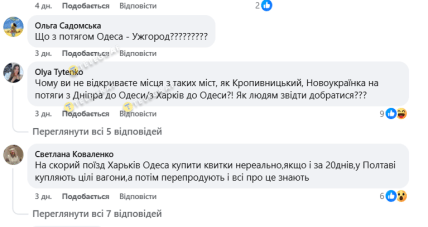 В июле сразу несколько популярных направлений испытывают проблемы с билетами. Такую проблему отметил бывший менеджер Укрзализныци Александр Рудоманов. Он рассказал о проблемах для киевлян приобрести билеты в Одессу из-за продолжения маршрута поезда в Житомир. В УЗ ему ответили, что киевляне имеют альтернативу, которой нет в Житомире.