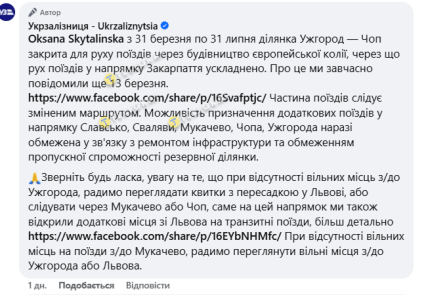 Но не только поезда из Одессы меняют расписание курсов. Из-за работы по строительству линии на участке Ужгород-Чоп до конца июля есть проблемы с поездами в Закарпатье. Часть железнодорожного транспорта сменила маршруты. Доехать стало сложнее до Ужгорода, Чопа, Свалявы, Славско. Украинцам советуют ехать через Львов с пересадками.