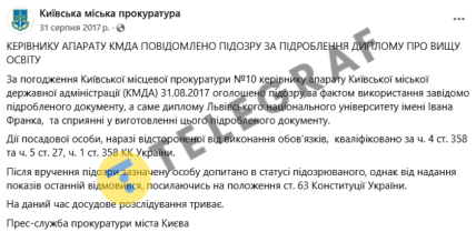 Журналисты программы "Схемы" выяснили, что диплом Львовского университета, который он предоставил, на самом деле ему не выдавали. После этого мэр Кличко уволил его, а правоохранители открыли производство по ст. 358 УК.