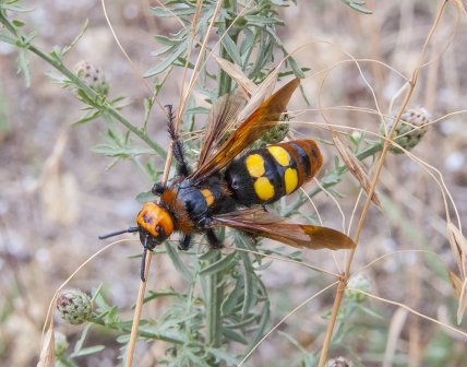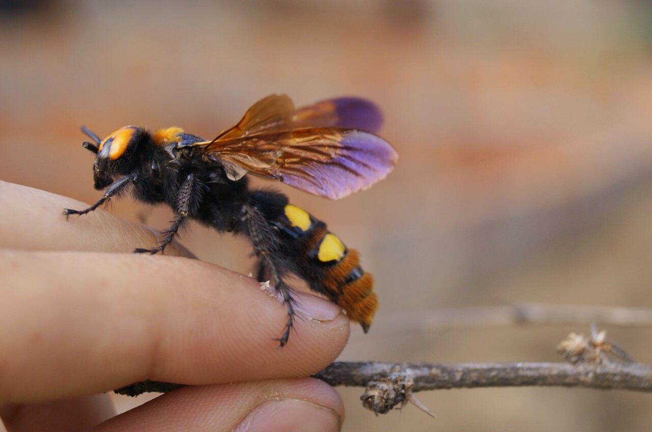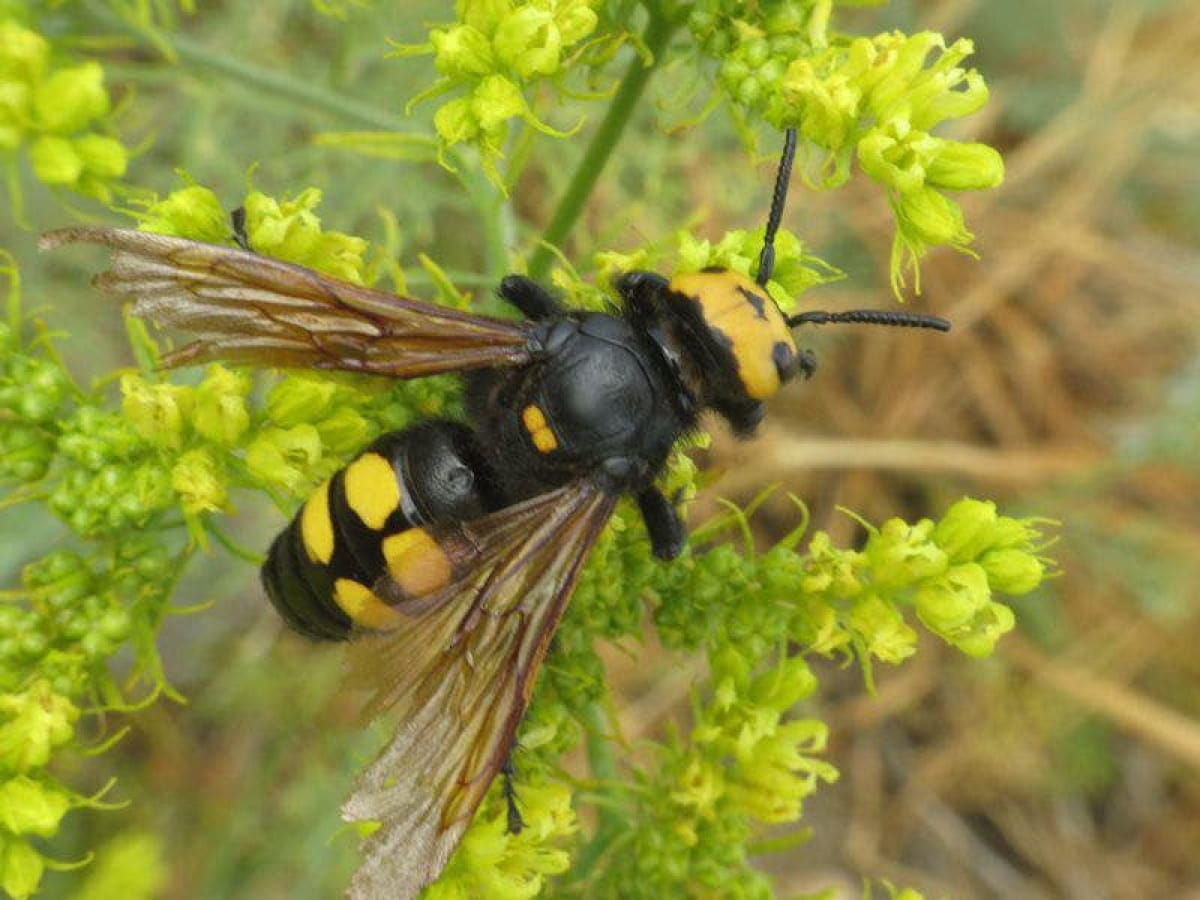 Когда вы впервые увидите сколию-гиганта, вы можете испугаться ее – почти 5 см длиной, черное тело с яркими желтыми пятнами и крылья с фиолетовым бликом. Но не торопитесь убегать: эти огромные осы абсолютно безопасны для человека и стали одними из самых мирных жителей украинских степей.