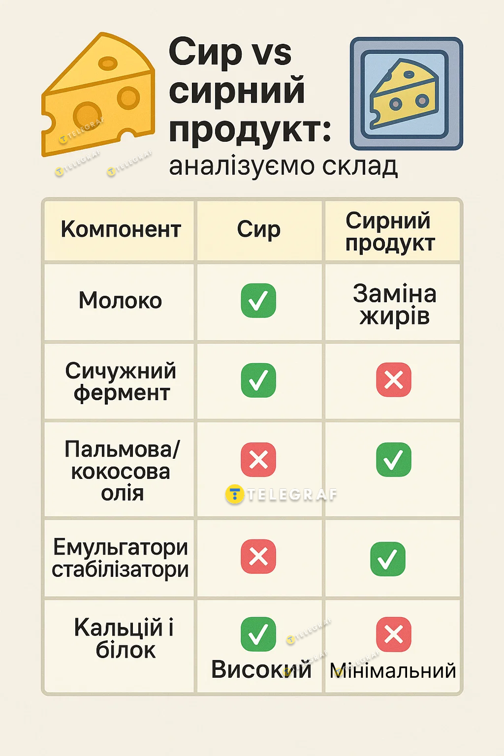 Такое сходство вводит потребителей в заблуждение, ведь оно выглядит как сыр и иногда даже имеет такой же вкус. Однако это — точно не сыр. В натуральном сыре должны быть молоко, закваска, сычужный фермент, соль, могут добавлять хлористый кальций для свертывания. Такой сыр дает организму белки, кальций, аминокислоты и т. д.