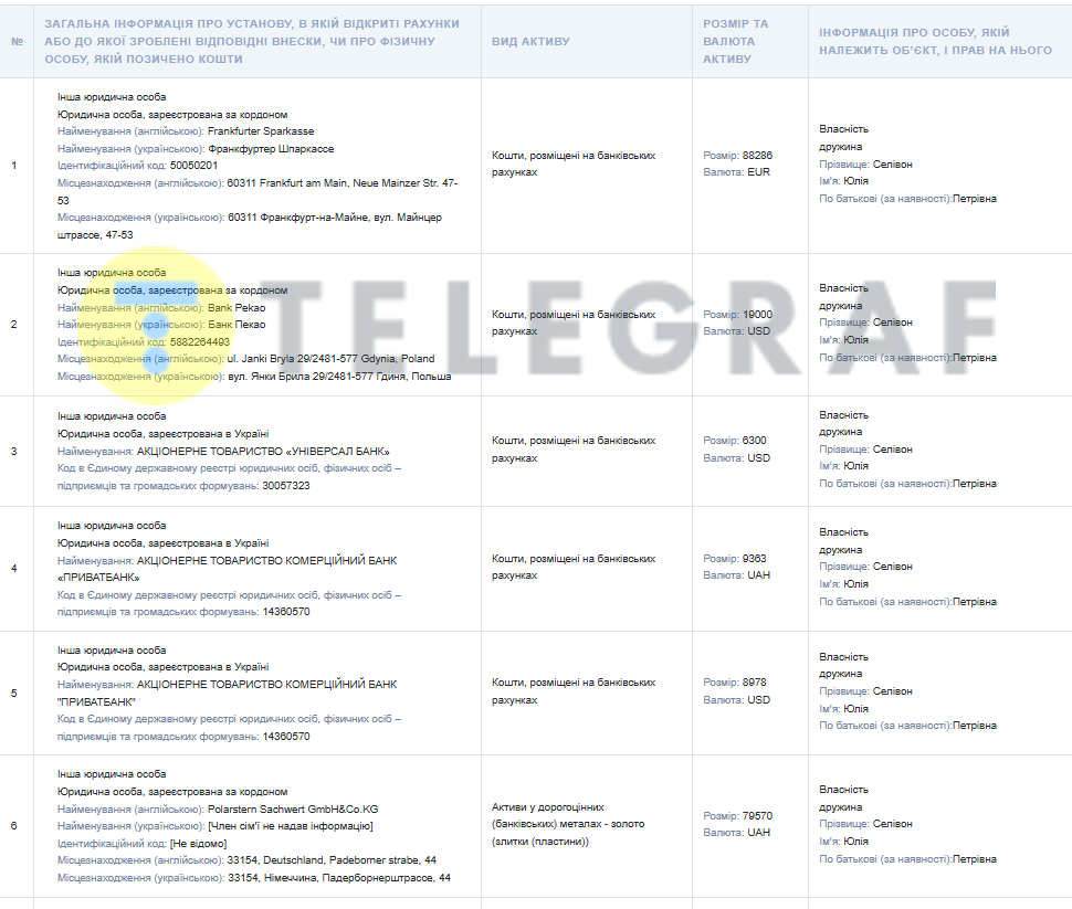 В документе отмечено, что у судьи нет собственных сбережений. В то время как его жена хранит на банковских счетах в целом 32 278 долларов, 88 286 евро и 9 363 гривен. Активы в драгоценных (банковских) металлах — 318 280 гривен.