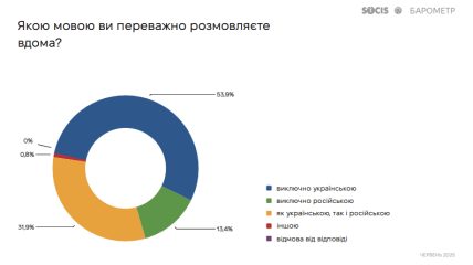Подавляющее большинство опрошенных — 53,9% — заявили, что дома говорят исключительно на украинском языке. Еще 31,9% сочетают украинский и русский, а 13,4% пользуются только русским. Еще 0,8% выбрали другие варианты, а 0% отказались отвечать.