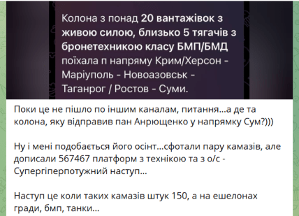 - Крым/Херсон — Мариуполь — Новоазовск-Таганрог/Ростов — Сумы (?) колонна более 20 грузовиков с живой силой, около 5 тягачей с бронетехникой класса БМП/БМД