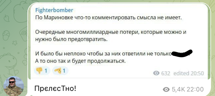 "Что касается Мариновки, комментировать что-то нет смысла. Очередные многомиллионные потери, которых можно было избежать", — пишут пропагандистские каналы.