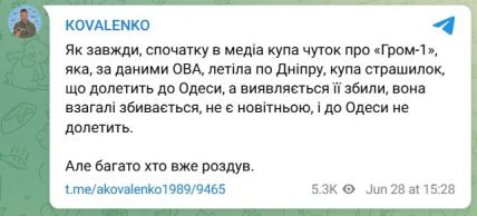 Глава Центра противодействия дезинформации Андрей Коваленко в свою очередь добавил, что бомба не является новой разработкой и до Одессы она не достанет.