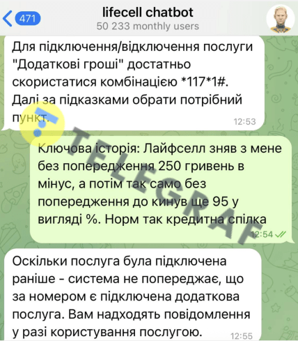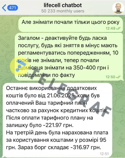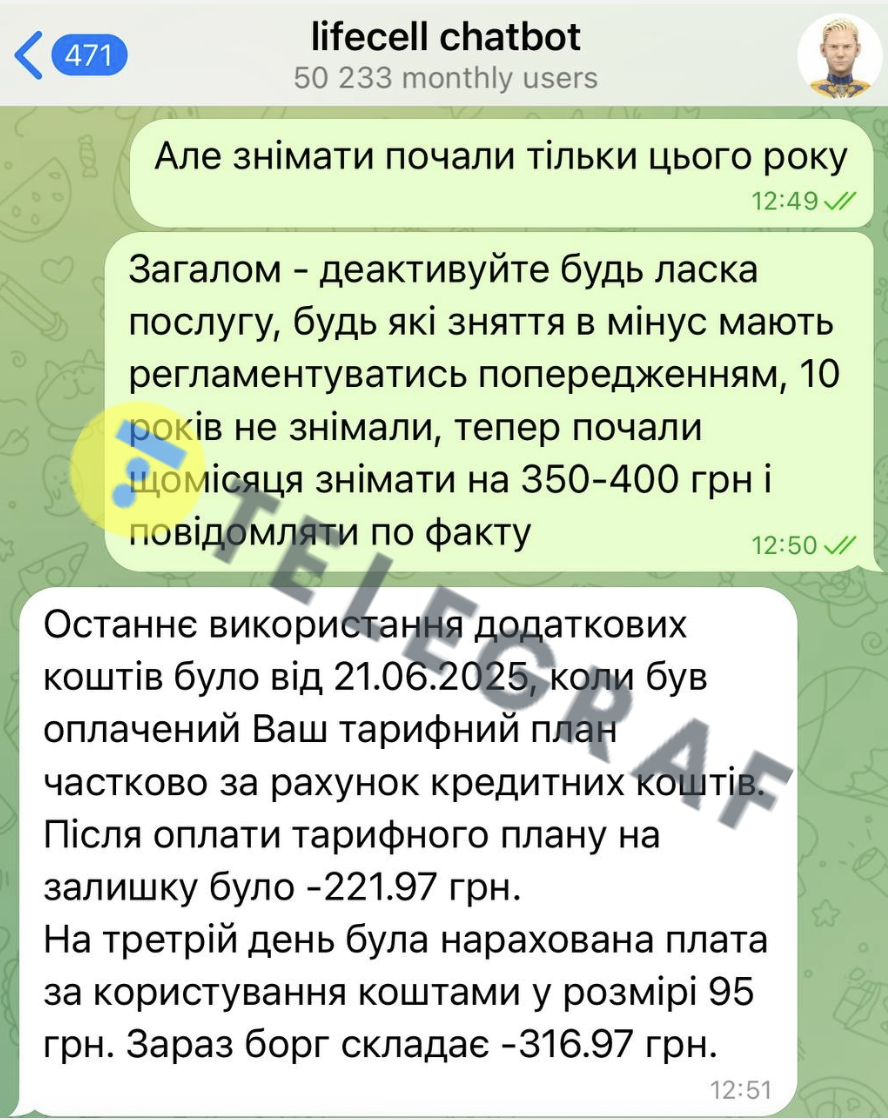 "Лайфсел снял с меня без предупреждения 250 грн в минус, а затем также без предупреждения докинул еще 95 в виде процентов", — говорится в сообщении.
