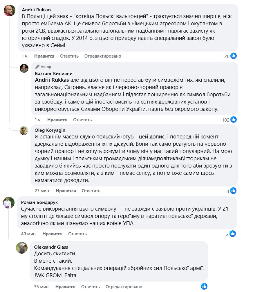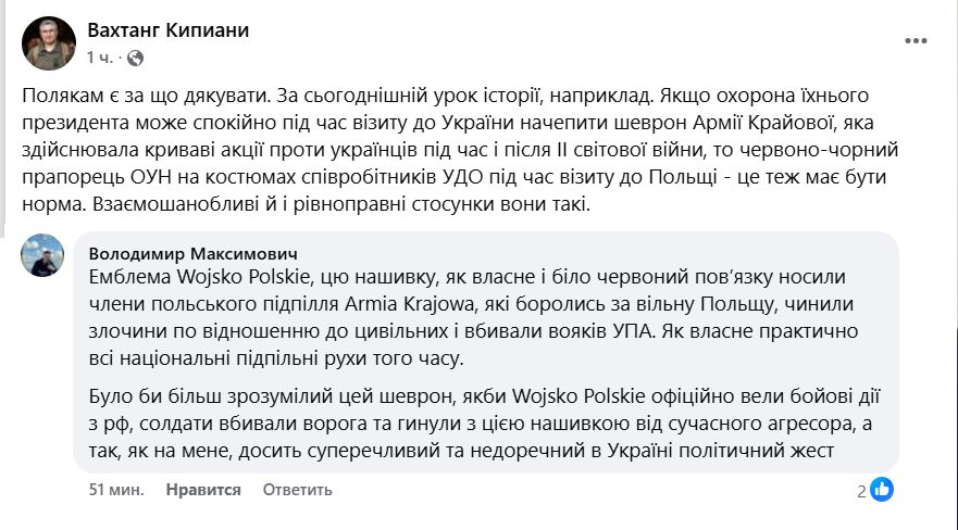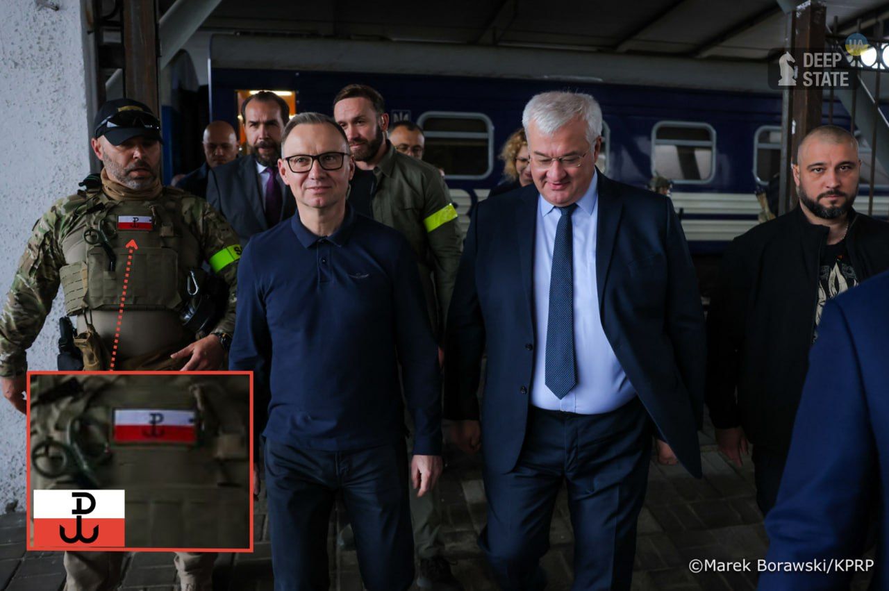Дело в том, что у его охранника заметили нагрудный символ "Армии Крайовой", подпольной организации, которая во времена Второй мировой войны была причастна к убийствам украинцев. Внимание на это обратил журналист и боец 13-й бригады НГУ Вахтанг Кипиани.