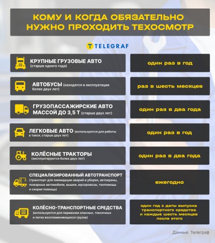 Дважды в год проверяют автобусы и транспорт для перевозки опасных грузов. Такая частота обзора связана с повышенными требованиями по безопасности.