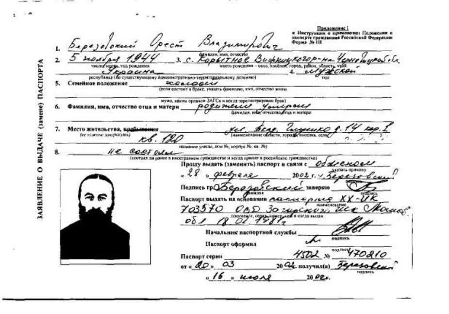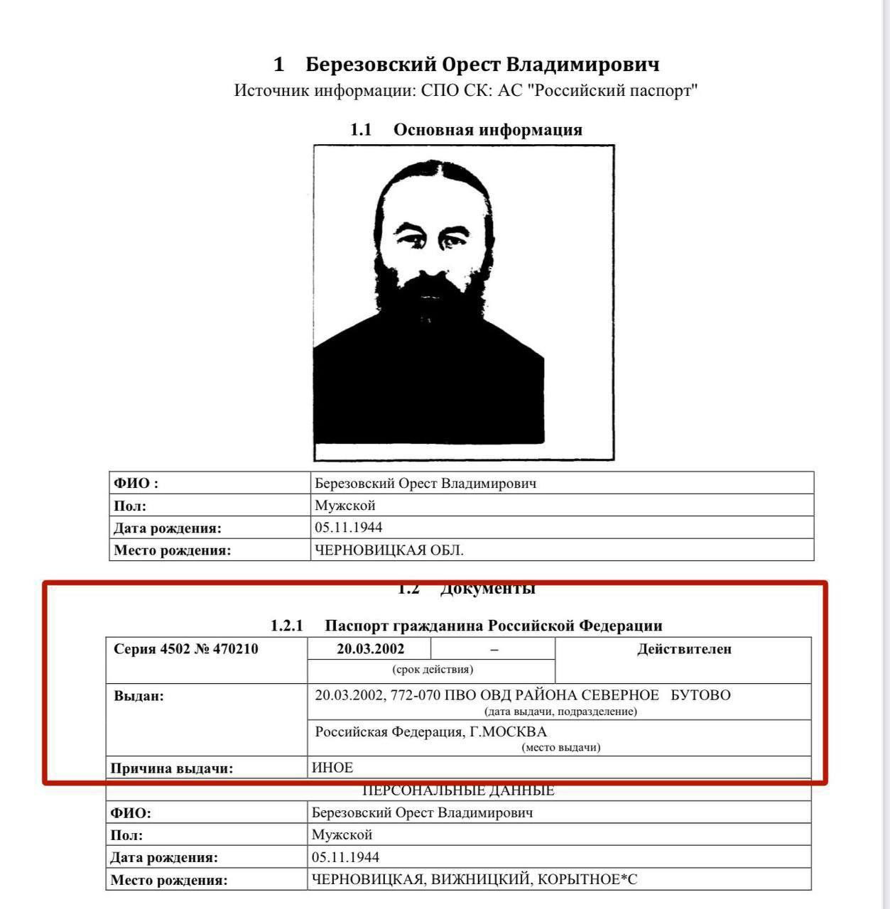 Обновлено: впоследствии в сети показали фото российского паспорта митрополита УПЦ (МП) Онуфрия. Как видим, данные по российской паспортной системе опровергают заявления УПЦ (МП), где говорят, что паспорта страны-террориста у Ореста Березовского, митрополита УПЦ (МП) Онуфрия, нет. Паспорт "действителен" — написано четко и однозначно.