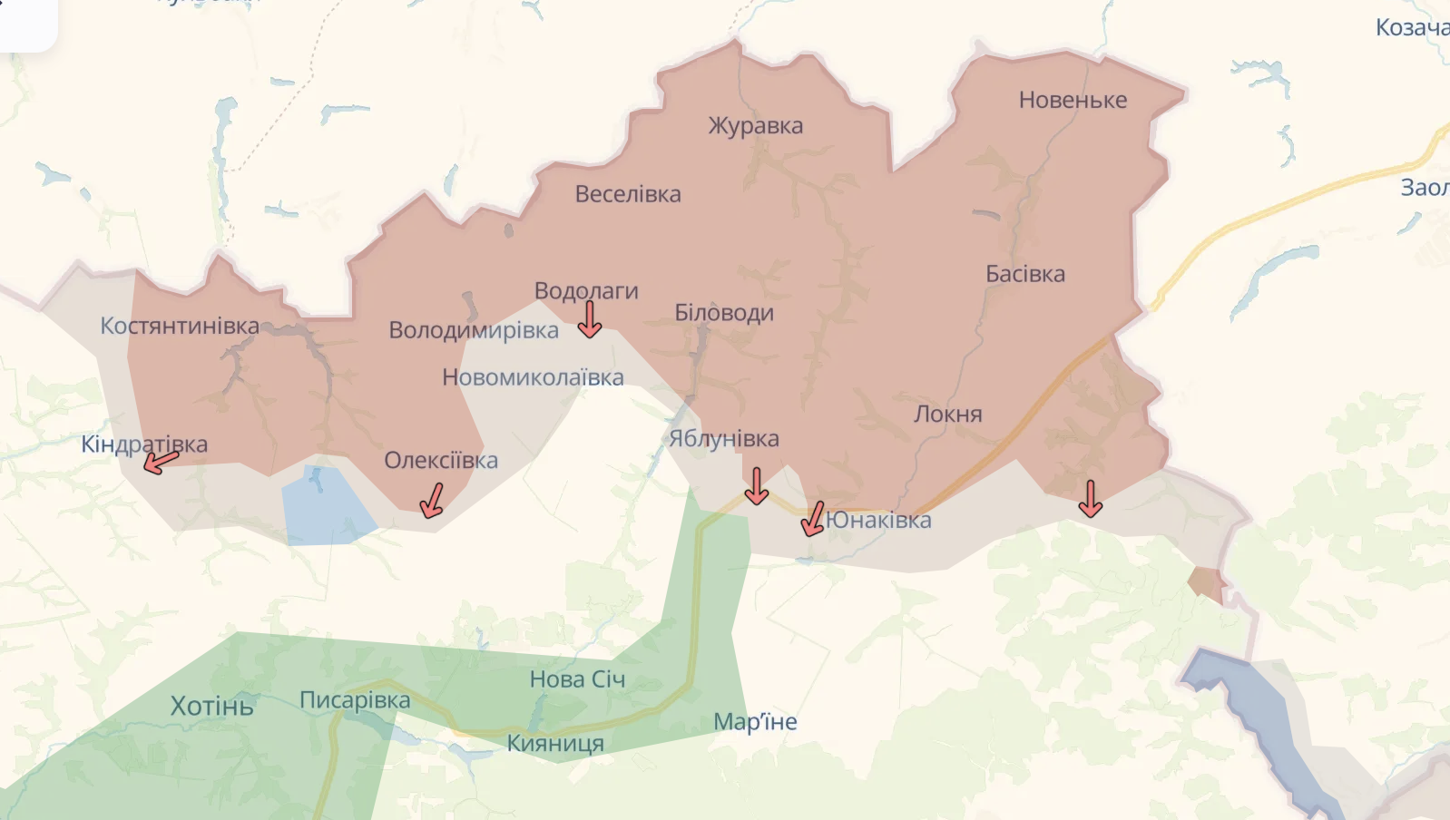 На представленной карте видно текущее состояние оккупированных территорий в северо-восточных регионах, включая части Сумской области. Красными стрелками обозначены главные направления, где ранее фиксировалась активность противника. Однако, начиная с 24 июня, на картах действительно можно увидеть отсутствие значительного продвижения вражеских войск в регионе.