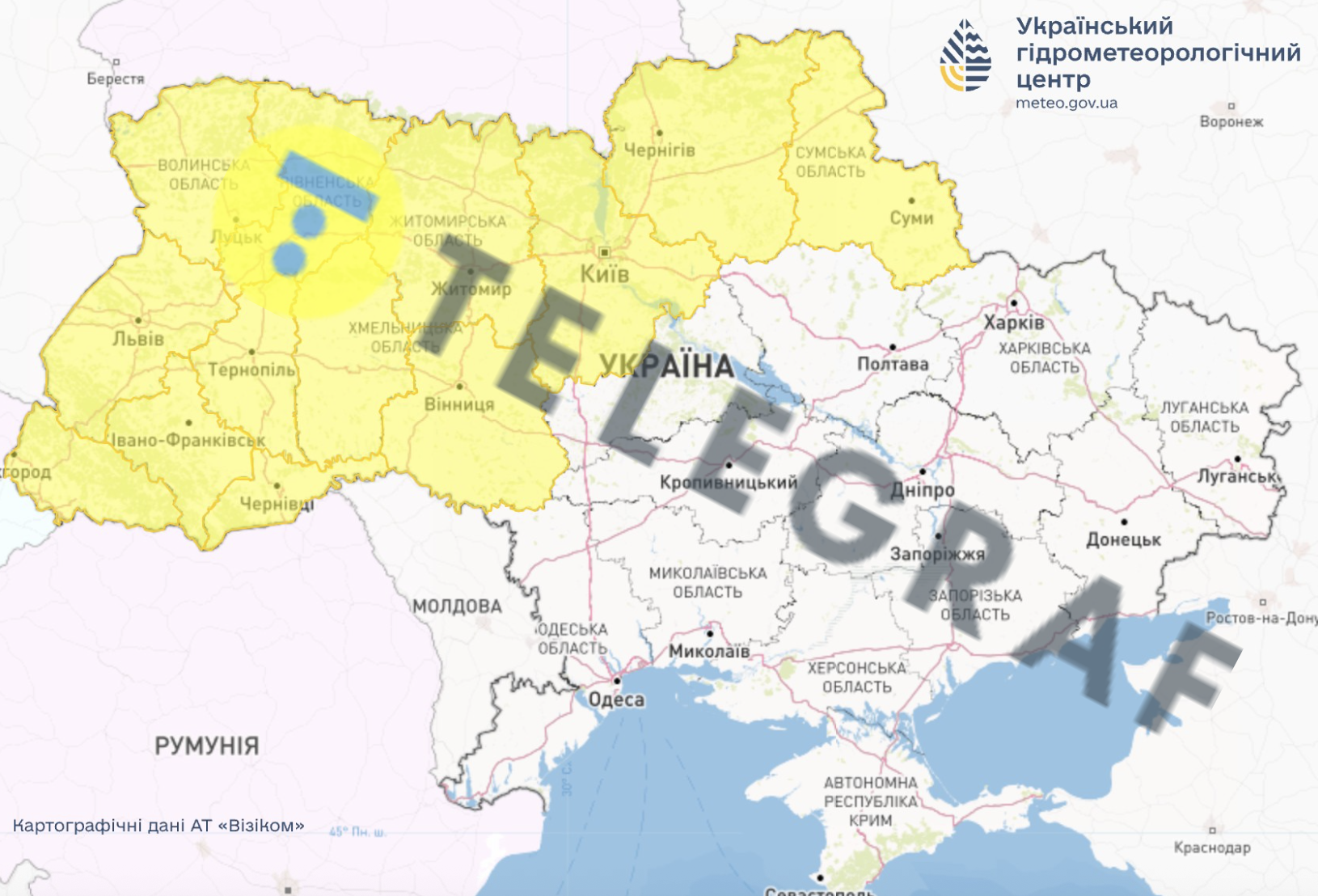 "4 июля днем в западных, северных и Винницких областях грозы, местами град и шквальный ветер 15-20 м/с (I уровень опасности, желтый)", — говорится в объявлении.