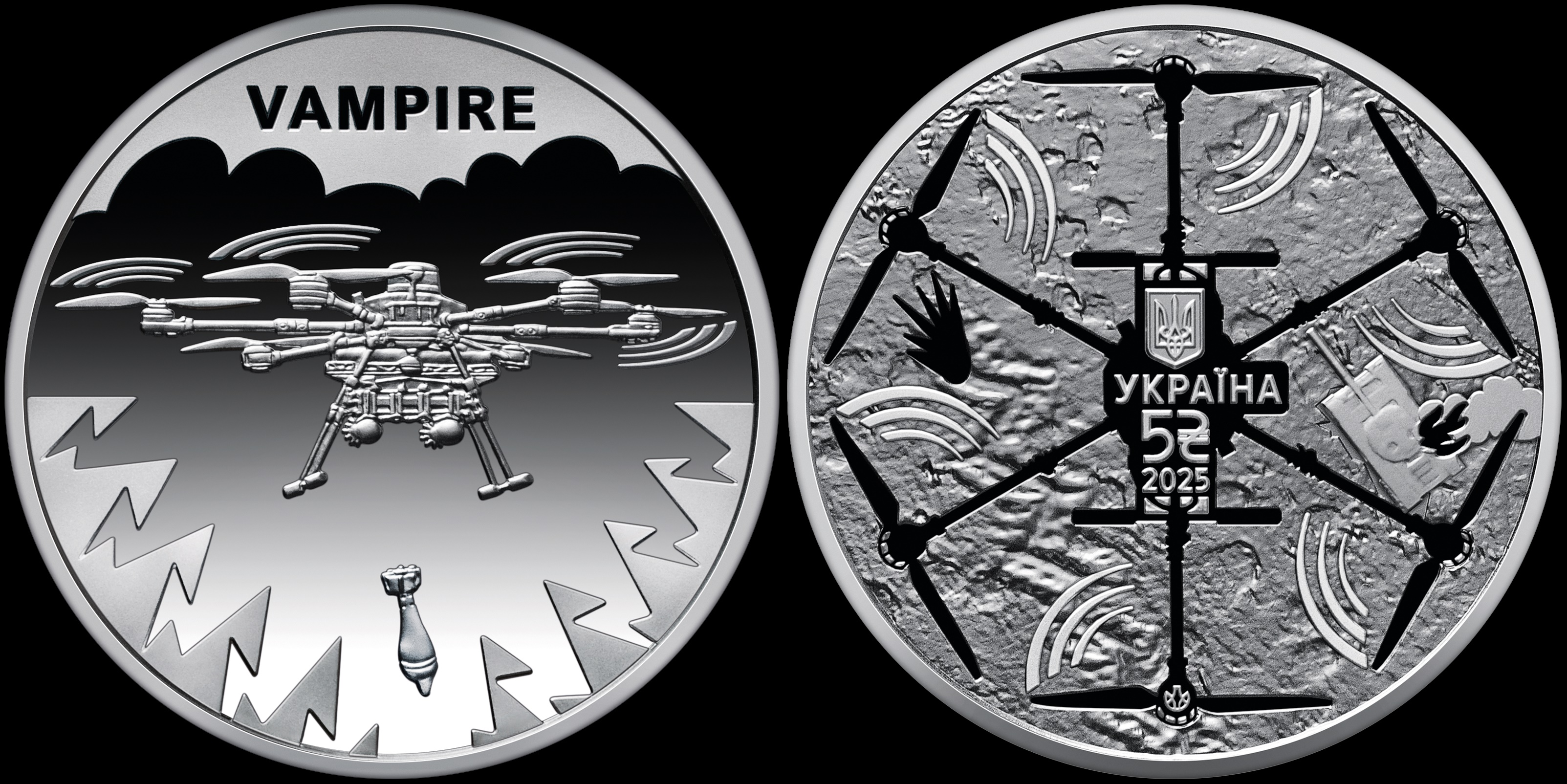 Выпуск монеты приурочен к третьей годовщине первого полета "Вампира", созданного украинской компанией SkyFall для защиты Украины от российской полномасштабной агрессии. Более миллиона боевых вылетов, выполненных украинскими военными с помощью этого дрона-бомбера, являются убедительным свидетельством его надежности и эффективности в условиях реального боя. Враг, хорошо зная мощь "Вампира", прозвал его "Бабой Ягой" — за характерный звук в небе и разрушительную силу ударов.