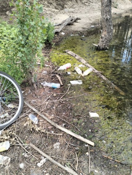 Теперь там горы мусора — куча выброшенных бутылок, лежащих прямо в воде, непонятных колес от велосипеда. "Русский мир" точно не пошел на пользу Северодонецку — теперь вода не выглядит чистой, а гулять там совершенно не хочется, судя по виду. Мусор лежит даже не у мусорников, а прямо в кустах, на песке.