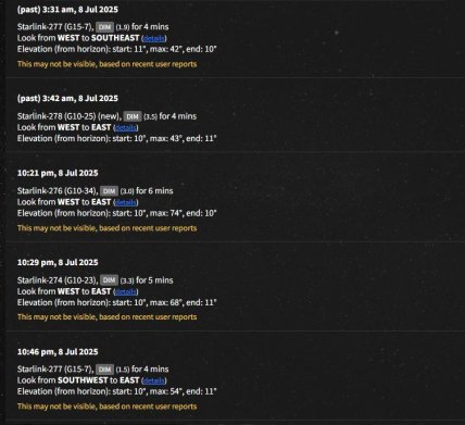 Стоит отметить, что наблюдение за "старлинками" может быть затруднено, так как из-за светового загрязнения в городских условиях вообще сложно что-либо рассмотреть на небе. Поэтому если хочется посмотреть на пролетающие спутник, то хорошим вариантом будет сначала выбраться на природу.