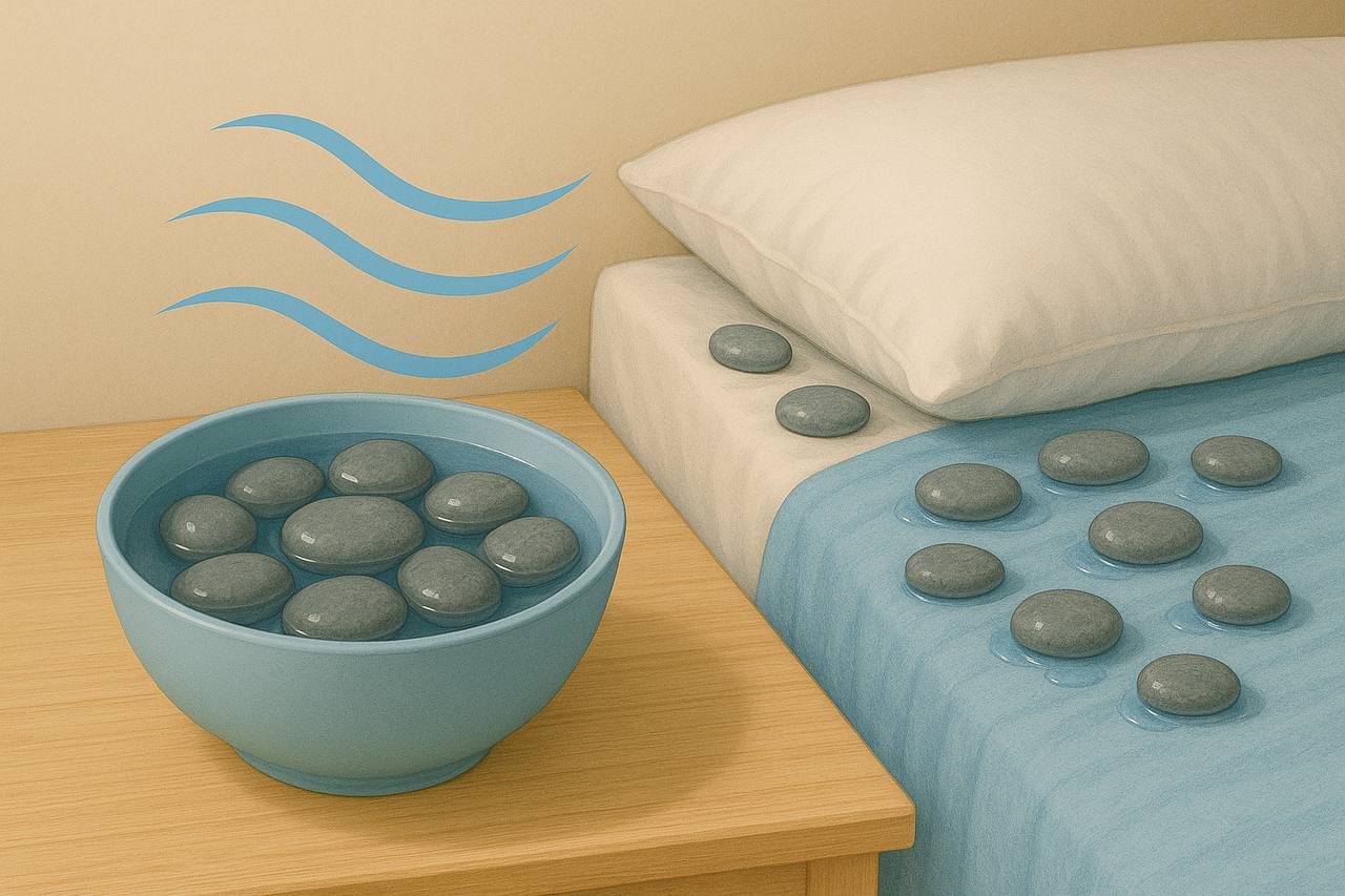 Камни необходимо замочить в холодной воде и разместить вокруг себя на постели. Они будут медленно отдавать прохладу, что хорошо поможет пережить жару.