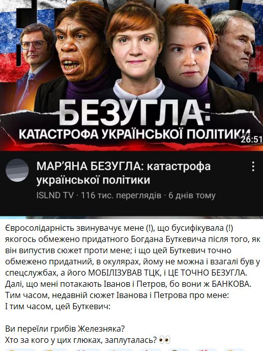 "Евросолидарность обвиняет меня (!) в бусификации (!) какого-то ограниченно пригодного Богдана Буткевича после того, как он выпустил сюжет против меня; и что этот Буткевич точно ограниченно пригоден, в очках, ему нельзя и вообще был в спецслужбах, а его МОБИЛИЗИРОВАЛ ТЦК и это точно Безуглая! Вы объелись грибов Железняка?", – написала она.