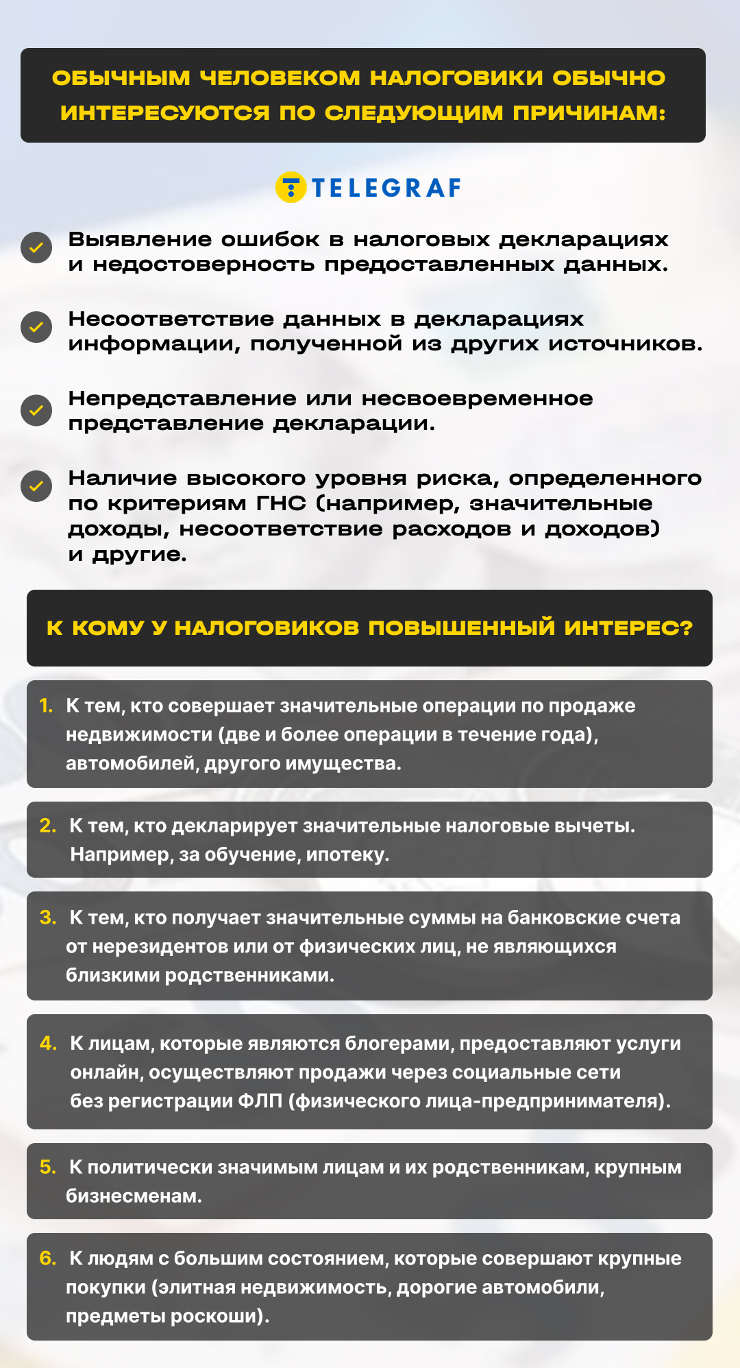Государственная налоговая служба контролирует доходы и уплату налогов с них рядовыми украинцами, анализируя их транзакции, открытые источники информации о движимом имуществе и реестры недвижимости.