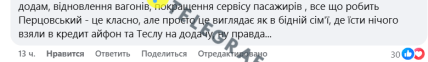"И за это все вы еще берете, и забираете доплаты, не повышаете зарплату и хотите Европы? Хотите и рыбку съесть, и….сесть? Так не бывает. Скоро все развалится, дойдет до критической точки, вот тогда все поймете. Вы еще там подумывали забрать выслугу лет у рабов? Сделайте это, я хочу на это посмотреть. (…) Еще добавлю, восстановление вагонов, улучшение сервиса пассажиров, все что делает Перцовский – это классно, но просто это выглядит как в бедной семье, где есть нечего взяли в кредит айфон и Теслу в придачу, ну правда", – пишет железнодорожник.