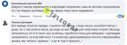 Она утверждает, что инженер в компании получает оклад 9000 грн, а ведущий инженер – 13000 грн. Люди боятся потерять работу из-за бронирования, хотя недовольны условиями, зарплатой, отношением и предпочитают "выполнять тупые и бессмысленные команды". "На некоторых станциях нет вообще никакой воды. Ни помыться, ни сходить в туалет, ни помыть пол. Воды нет! Да и туалетов тоже", – добавляет автор.
