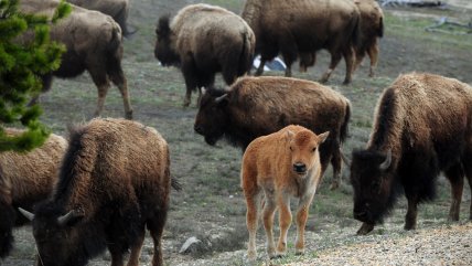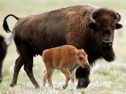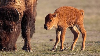 Маленькие бизончики рождаются с характерным рыжеватым мехом, который постепенно темнеет и через полгода станет темно-коричневым. Это естественный механизм маскировки, помогающий животным лучше сливаться с окружающей средой. Малыши бизона очень быстро встают на ноги и почти сразу начинают следовать за матерью — такое поведение жизненно важно для выживания в дикой природе.