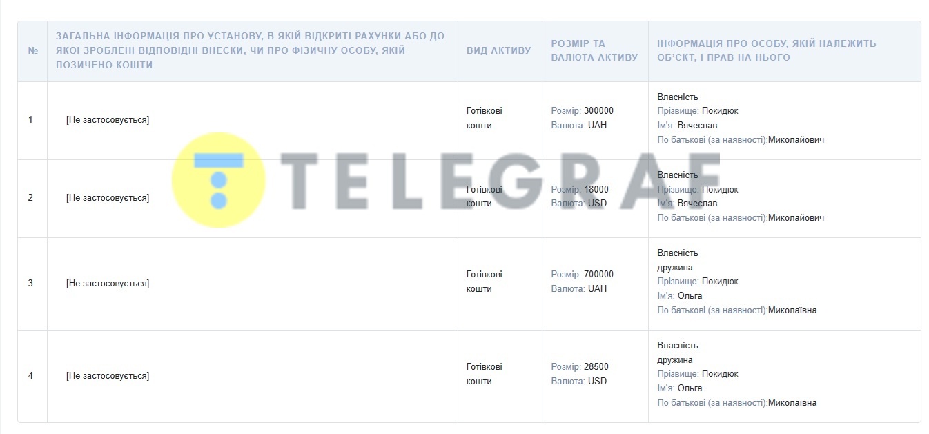 По "матрасом" Покидюк имеет около миллиона гривен (в долларах и гривнах), а его жена около двух миллионов (в долларах и гривнах).