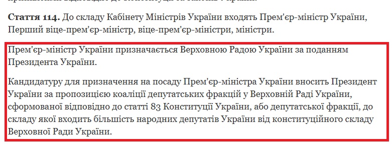 Согласно статье 114 премьер-министр назначается Верховной Радой Украины по представлению Президента Украины.