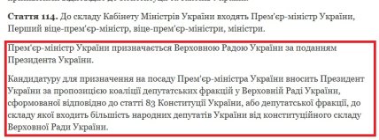 "Кандидатуру для назначения на должность Премьер-министра Украины вносит президент Украины по предложению коалиции депутатских фракций в Верховной Раде Украины, сформированной в соответствии со статьей 83 Конституции Украины или депутатской фракции, в состав которой входит большинство народных депутатов Украины от конституционного состава Верховной Рады Украины", — гласит закон.
