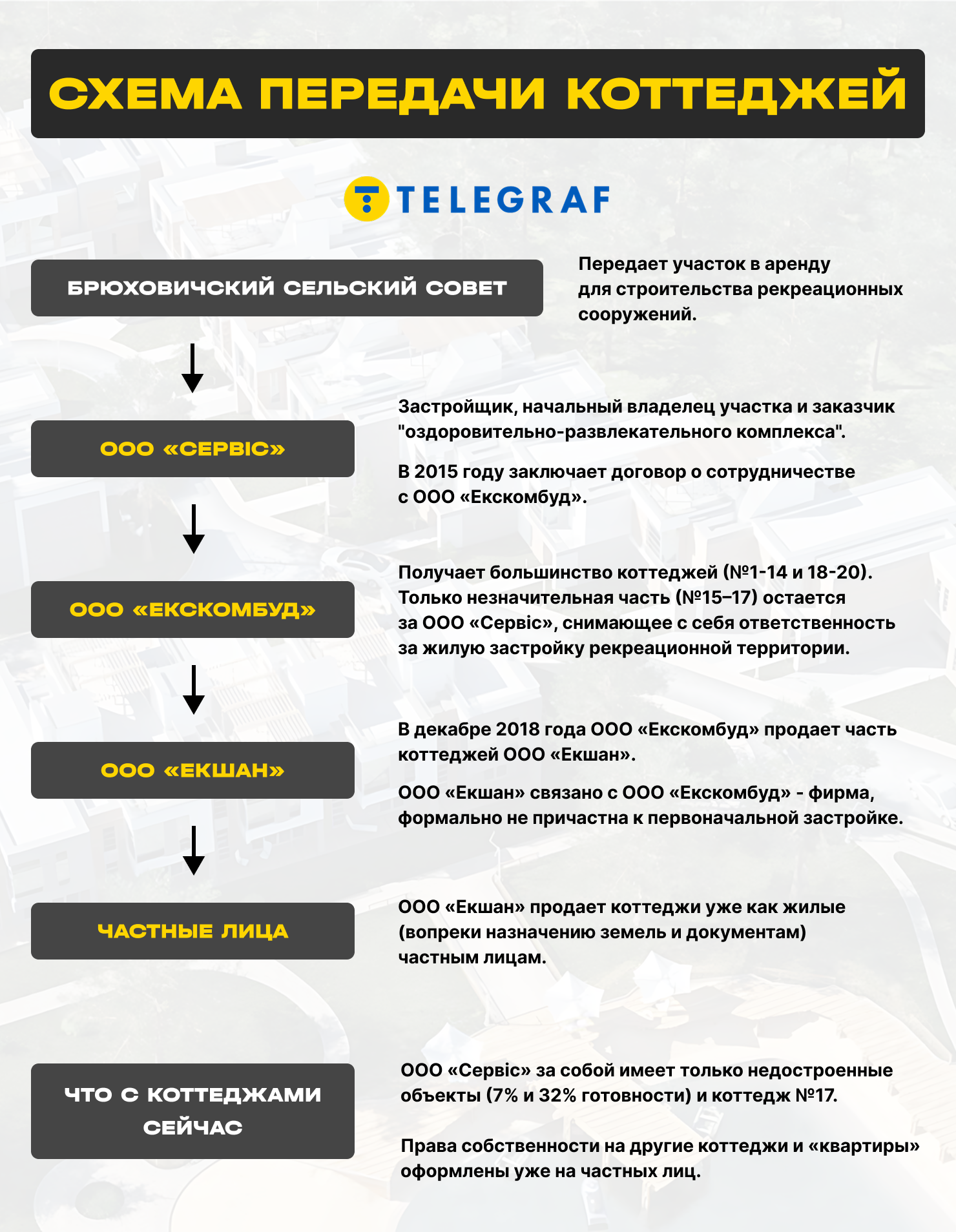 ООО "Экшан" (то самое, которое, собственно, продавало коттеджи частным лицам) на 100% принадлежит ООО "ФК "ЭКСКОМСТРОЙ-ИНВЕСТ", связанному с "Экскомстрой". В свою очередь владельцем ООО "ФК "ЭКСКОМСТРОЙ-ИНВЕСТ" является Шушанский Василий Маркиянович. Компания была задействована сразу в нескольких строительных проектах во Львове и области — ЖК "Старый Сихов", ЖК "Галицкая Брама" и т.д.