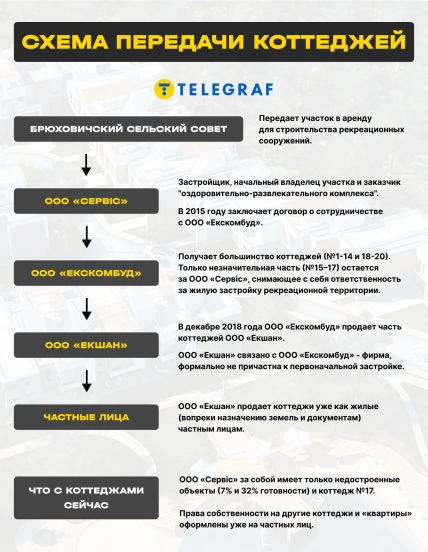 Но лишь незначительная часть этих сооружений (коттеджи №№15-17) были закреплены за ООО "Сервис", то есть начальной договорной стороной с Брюховичским поселковым советом. Львиная же доля – (коттеджи №№1-14 и 18-20) – отошли ООО "Экскомстрой".