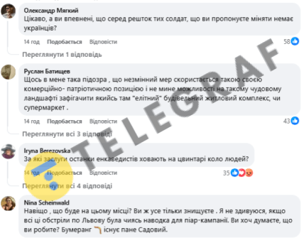 Сообщение мэра вызвало неоднозначную реакцию украинцев. Часть поддержала решение о ликвидации советского мемориала, считая это правильным шагом во время войны. Однако другие критиковали расходы на эксгумацию, считая, что средства лучше было бы направить на нужды ВСУ. Некоторые комментаторы опасаются будущего использования освобожденной территории.