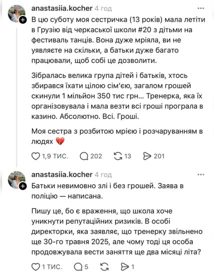 После того как разразился скандал, Черкасская специализированная школа I-III ступеней № 20 сообщила в соцсетях, что указанная поездка носила частный характер. При этом администрация школы не владела информацией о ее организации и подготовке. Относительно тренера в публикации объяснили, что женщина работала в школе в течение учебного года по совместительству и была уволена с должности хореографа 30 мая 2025 года. Администрация всячески содействует правоохранителям в проведении расследования и надеется, что мошенницу накажут, а пострадавшим вернут деньги.