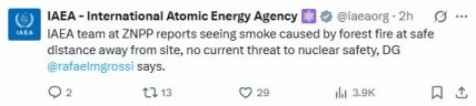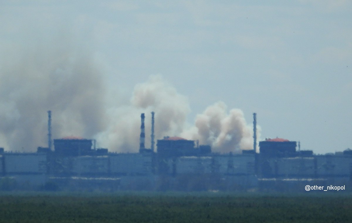 UPD: Задымление возле ЗАЭС вызвал лесной пожар, сообщили в МАГАТЭ. Возгорание произошло на безопасном расстоянии от станции, поэтому угрозы ядерной безопасности нет.