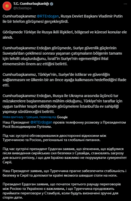 "Президент Эрдоган заявил, что начало третьего раунда переговоров между Россией и Украиной имеет решающее значение, и что Турция продолжит проводить переговоры в Стамбуле, как только будут определены соответствующие даты для сторон", – отметили в офисе турецкого лидера.