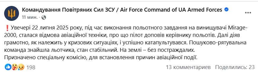 В Волынской области разбился самолет Mirage-2000 Воздушных сил ВСУ. Причиной инцидента называется отказ авиационной техники.