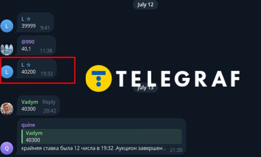 Аукцион проходил онлайн, — начальная ставка составила всего 1000 гривен. Торги завершились 12 июля в 19.32, а победную ставку сделал пользователь Лука.
