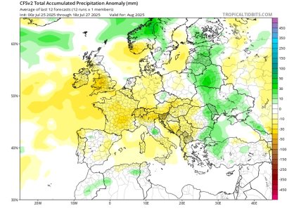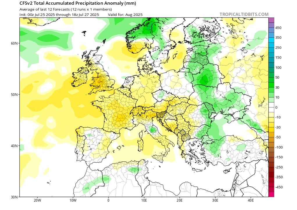 На карте представлено прогностическое поле распределения аномалии количества осадков в Европе на август 2025: