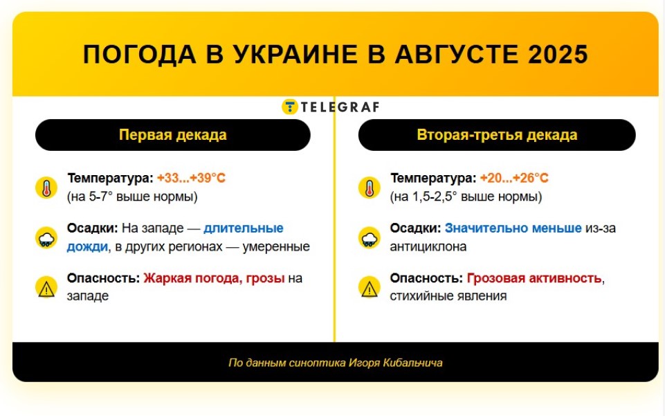 Во второй и третьей декадах августа температура воздуха в Украине станет более равномерной. В большинстве регионов установится типичная летняя погода с температурой, близкой к норме. Из-за смены погодного режима на антициклональный после 10 августа количество осадков в Украине существенно уменьшится.