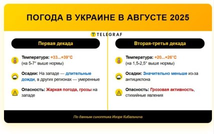 В первой декаде августа ожидается вторжение прохладного и влажного воздуха из северных широт в направлении центральной и южной Европы. Однако в восточные районы Европы, включая Украину, из Малой Азии и Кавказа поступит жаркий воздух. Потому в большинстве областей Украины будет жаркая погода уже в начале августа. Дневные температуры будут в диапазоне +33…+39 градусов выше нуля. Это аж на 5-7 градусов выше многолетней нормы. На западе Украины будет прохладнее — здесь также возможны продолжительные дожди и грозы.